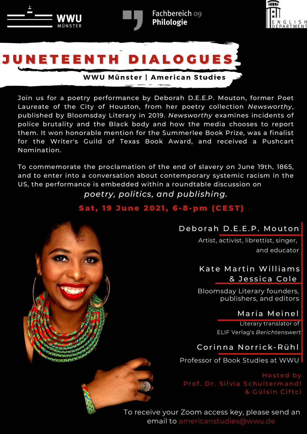 Am Samstag, 19. Juni, dem Gedenktag Juneteenth, findet um 18 Uhr über Zoom eine Poesie-Performance von Deborah D.E.E.P. Mouton statt. Prof. Dr. Silvia Schultermandl und Gülsin Ciftci, beide vom Englischen Seminar der WWU Münster, moderieren den Abend, an dem Deborah D.E.E.P. Mouton, ehemalige Poeta Laureatus der Stadt Houston, aus ihrer Gedichtsammlung Newsworthy liest, die 2019 von Bloomsday Literary veröffentlicht wurde. Newsworthy beschäftigt sich mit Vorfällen mit Polizeibrutalität, schwarzen Körpern und wie Medien darüber berichten. Mit Newsworthy war Mouton Finalistin beim Writer's Guild of Texas Book Award und sie erhielt eine Pushcart-Nominierung. An dem Abend nehmen neben der Schriftstellerin auch Kate Martin Williams und Jessica Cole von Bloomsday Literary, die Übersetzerin Maria Meinel und Prof. Dr. Corinna Norrick-Rühl (Book Studies an der WWU) teil. Bitte senden Sie für die Zoom-Zugangsdaten eine E-Mail an americanstudies@wwu.de.