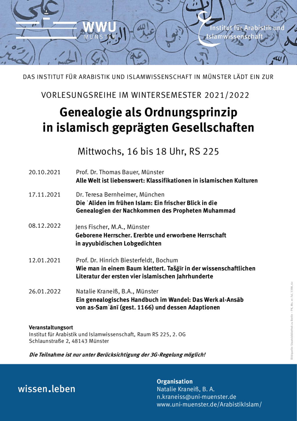 Die fünf Vorträge finden mittwochs von 16 bis 18 Uhr in Präsenz statt, und zwar im Institut für Arabistik und Islamwissenschaft, Raum RS 225, 2. OG (Schlaunstraße 2). Es gilt die 3G-Coronaschutz-Regel. Interessierte sind herzlich willkommen.