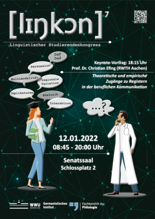 Im Januar findet zum siebten Mal der linguistische Studierendenkongress "Linkon" statt. Er wird von Studierenden des philologienübergreifenden Masterprogramms "Empirische und Angewandte Sprachwissenschaft" der WWU Münster organisiert. Ziel der eintägigen Online-Veranstaltung ist es, Einblicke in aktuelle Studienprojekte zu bekommen sowie den Austausch und die fachliche Diskussion zwischen verschiedenen Studiengängen, Studierenden sowie Fachwissenschaftlerinnen und Fachwissenschaftlern zu stärken.