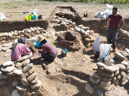 Im Rahmen des von der Deutschen Forschungsgemeinschaft (DFG) geförderten Forschungsprojektes "Lebenswelten des frühen 1. Jt. v. C. im westlichen Zagrosrandgebirge am Unteren Zab vor und nach der assyrischen Annexion: Das zivile Zentrum des Dinka Siedlungskomplexes in der Peshdar-Ebene" hat unter Leitung von Prof. Dr. F. Janoscha Kreppner vom Institut für Altorientalistik und Vorderasiatischer Archäologie von Mitte August bis Mitte Oktober eine zweimonatige Ausgrabungskampagne im Nordirak stattgefunden. Der Fundort liegt in der Autonomen Region Kurdistan des Irak ca. 5 km südlich der Kreisstadt Qaladze in der Provinz Sulaymaniyah unmittelbar an der Grenze zum Iran. Der über Jahrtausende vom Chalkolithikum bis in die islamische Epoche besiedelte Fundort blühte in der Eisenzeit I (ca. 1250-1050 v. Chr.) auf und erreichte seine größte Siedlungsausdehnung von ca. 60 ha in der Eisenzeit II (ca. 1050-800 v. Chr.) bereits vor der assyrischen Annexion der Peshdar-Ebene und der Siedlung in der Eisenzeit III (ca. 800-600 v. Chr.). Ziel der Ausgrabungen 2022 war das Gebäude K, das Bestandteil eines etwas abseits am Rande der Unterstadt gelegenen Gebäudekomplexes ist und von der kleinteiligen Wohnbebauung der Unterstadt durch eine Freifläche getrennt ist. Im Herbst 2022 wurden ergänzend zu den Ausgrabungen 2017 und 2021 450 qm Fläche ausgegraben (Abb. 1).