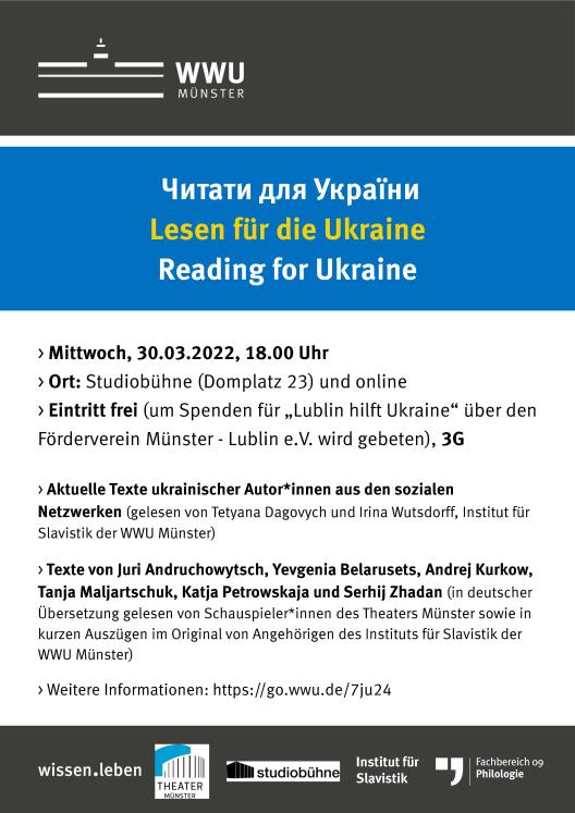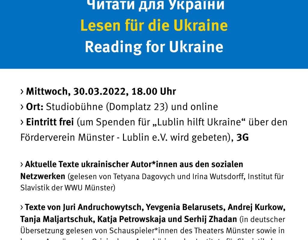 Am Mittwoch, 30. März, findet um 18 Uhr die Veranstaltung "Читати для України / Lesen für die Ukraine / Reading for Ukraine" in der Studiobühne der WWU Münster (Domplatz 23) statt.