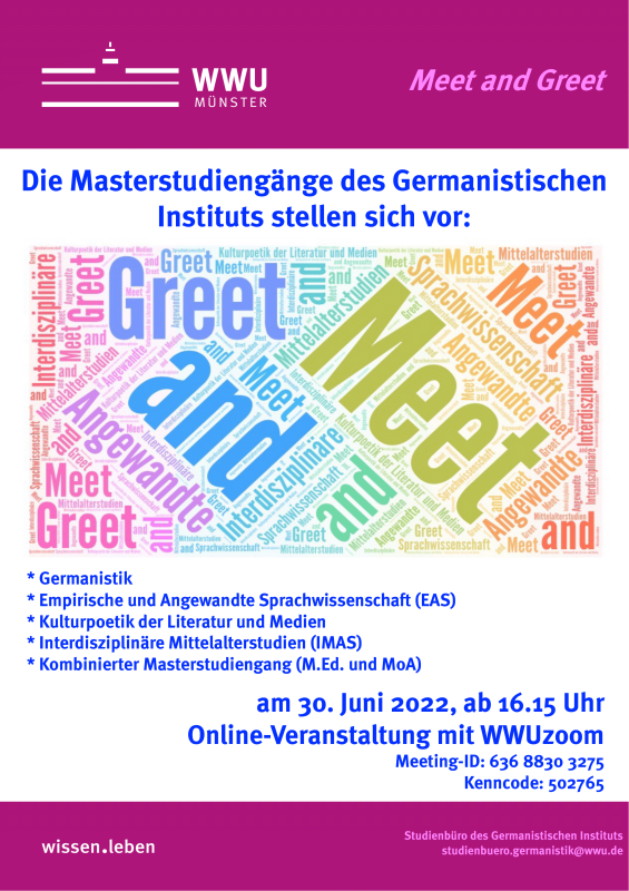 Zum Wintersemester 2022/2023 werden am Germanistischen Institut der Universität Münster wieder neue Studierende in die Master of Arts-Programme aufgenommen. Bewerbungs- bzw. Anmeldeschluss ist der 15. Juli. In einer digitalen "Meet & Greet"-Veranstaltung stellen sich am Donnerstag, 30. Juni, ab 16.15 Uhr die Masterstudiengänge vor. Die Fachvertreterinnen und -vertreter der einzelnen Master-Programme (Germanistik, Angewandte Sprachwissenschaft, Kulturpoetik der Literatur und Medien und Interdisziplinäre Mittelalterstudien) stehen für alle Fragen rund um das Studium in lockerer Gesprächsatmosphäre zur Verfügung. Zusätzlich gibt es die Möglichkeit, sich über die Kombination von Master of Education- und Master of Arts-Studiengängen beraten zu lassen.