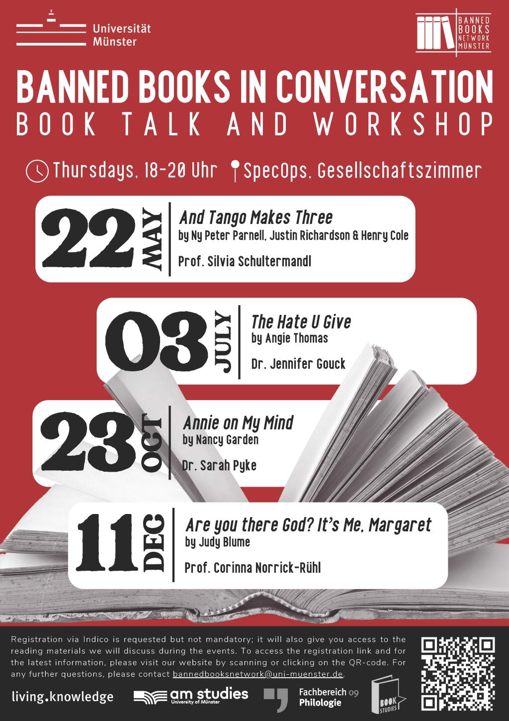 Das Banned Books Network Münster (BBNM), das im Frühjahr 2025 von den Lehrstühlen für Book Studies (Prof. Dr. Corinna Norrick-Rühl) und American Studies (Prof. Dr. Silvia Schultermandl) vom Englischen Seminar der Universität Münster gegründet wurde, lädt alle Interessierten zu öffentlichen Veranstaltungen im Wintersemester ein. Die Reihe "Banned Books in Conversation" wird am 23. Oktober (Dr. Sarah Pyke über "Annie on My Mind" von Nancy Garden, Anmeldung: https://indico.uni-muenster.de/event/3584/) und 11. Dezember (Prof. Dr. Corinna Norrick-Rühl über "Are You There God? It’s Me, Margaret" von Judy Blume, Anmeldung: https://indico.uni-muenster.de/event/3585/) fortgesetzt. Die Veranstaltungen beginnen jeweils um 18 Uhr im Gesellschaftszimmer des Café SpecOps, Aegidiimarkt 5.