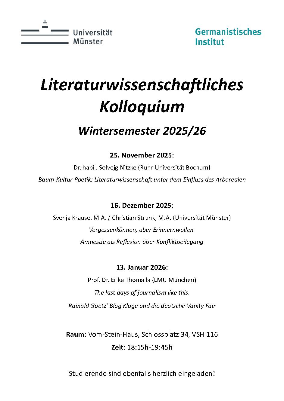 - Dienstag, 13. Januar 2026, Prof. Dr. Erika Thomalla (LMU München): "The last days of journalism like this. Rainald Goetz’ Blog 'Klage' und die deutsche Vanity Fair"
