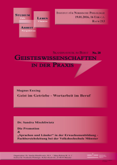 Am Dienstag, 19. Januar, findet die nächste Auflage der Reihe "Geisteswissenschaften in der Praxis" im Institut für Nordische Philologie statt, zu der dieses Mal zwei institutsinterne Referenten eingeladen sind. Dr. Sandra Mischliwietz arbeitet als wissenschaftliche Mitarbeiterin am Institut für Nordische Philologie und als Fachbereichsleiterin an der Volkshochschule Münster. In ihrem Doppelvortrag "Die Promotion & ‚Sprachen und Länder‘ in der Erwachsenenbildung - Fachbereichsleitung bei der Volkshochschule Münster" stellt sie beide Arbeitsfelder vor. Magnus Enxing, Norwegisch-Lektor am Institut für Nordische Philologie, berichtet in seinem Vortrag "Geist im Getriebe - Wortarbeit im Beruf" unter anderem über seine Tätigkeit als Dozent an der Volkshochschule. Die Veranstaltung beginnt um 16.15 Uhr in Raum 213 des Instituts, Robert-Koch-Straße 29. Alle Interessierten sind herzlich willkommen.