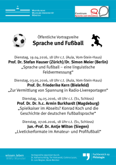 2016 ist das Jahr der Fußball-Europameisterschaft der Männer in Frankreich. Ein geeigneter Zeitpunkt, sich aus linguistischer Perspektive mit dem Gegenstandsbereich "Sprache und Fußball" genauer auseinanderzusetzen. Zwischen Mitte April und Anfang Juni lädt das Germanistische Institut der Universität Münster daher alle Sprach- und Fußballinteressierten zu vier öffentlichen Vorträgen ein, in denen Sprachwissenschaftlerinnen und -wissenschaftler die vielfältigen Zusammenhänge von Fußball und Sprache beleuchten.
