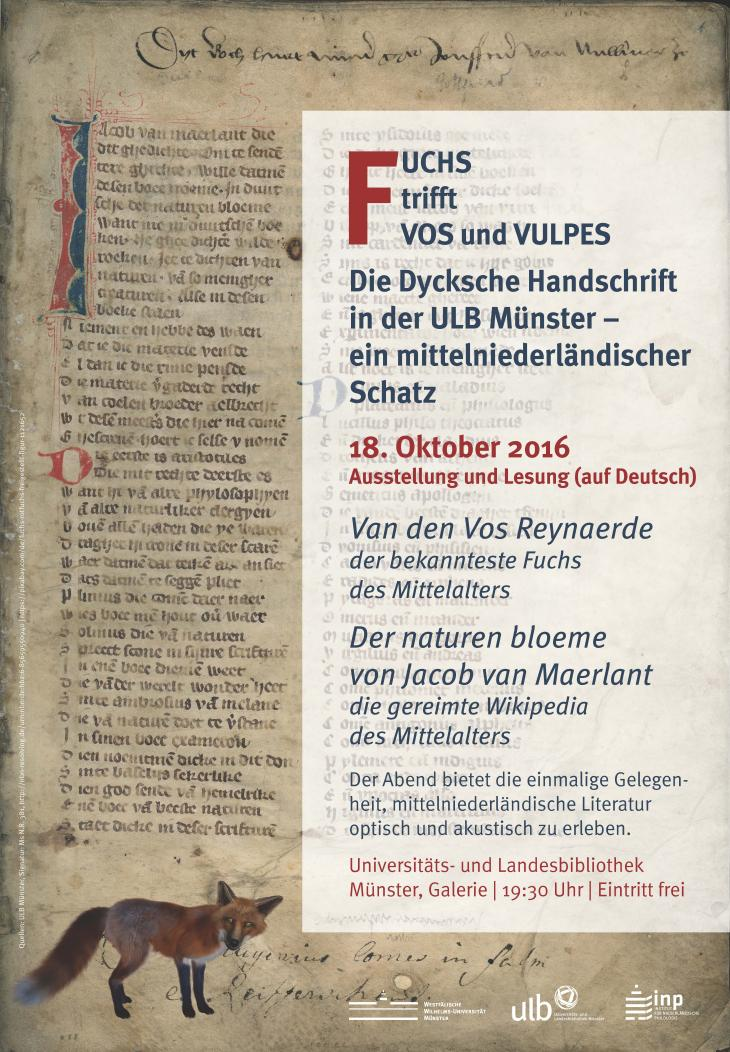 In der Universitäts- und Landesbibliothek Münster (ULB) liegt ein wahrer Schatz mittelniederländischer Literatur: die Dycksche Handschrift aus dem 14. Jahrhundert. Überliefert sind darin die gereimte Wikipedia des Mittelalters, "Der naturen bloeme" von Jacob van Maerlant, und "Van den vos Reynaerde", der Vorläufer des in Deutschland bekannten Reineke Fuchs. Für die Öffentlichkeit sind alte Handschriften aufgrund ihrer Anfälligkeit nur schwer zugänglich. Am Dienstag, 18. Oktober, wird die Dycksche Handschrift jedoch für wenige Stunden aus dem Archiv geholt und ausgestellt. Beginn der von Lesungen flankierten Ausstellung ist um 19:30 Uhr in der Galerie der ULB, Krummer Timpen 3. Alle Interessierten sind herzlich eingeladen. Der Eintritt ist frei.