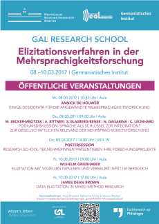 Die Podiumsdiskussion ist Teil der "GAL Research School Elizitationsverfahren in der Mehrsprachigkeitsforschung", zu der vom 8. bis 10. März dreißig Nachwuchswissenschaftlerinnen und -wissenschaftler aus dem In- und Ausland ans Germanistische Institut kommen. Ziel der von der Gesellschaft für Angewandte Linguistik (GAL e.V.) geförderten "GAL Research Schools" ist es, Nachwuchswissenschaftlerinnen und -wissenschaftlern die Möglichkeit zu geben, sich intensiv mit Forschungsmethoden der Angewandten Sprachwissenschaft auseinanderzusetzen und ihre eigenen Projekte mit etablierten Expertinnen und Experten zu diskutieren. Bei der Tagung in Münster stehen die unter dem Begriff "Elizitation" subsumierten Datenerhebungsverfahren im Mittelpunkt, bei denen Probandinnen und Probanden gezielt zur Datenproduktion aufgefordert werden.
