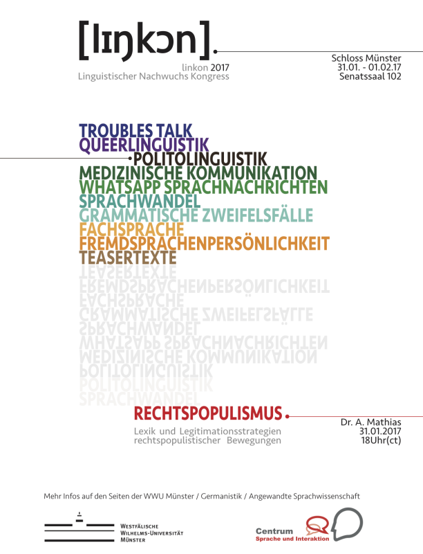 Der Gastvortrag findet statt im Rahmen von [linkon], einem linguistischen Nachwuchskongress, den Studierende des Masterstudiengangs "Angewandte Sprachwissenschaft" des Germanistischen Instituts organisiert haben. In Kurzvorträgen stellen die Studierenden am Dienstag, 31. Januar, ab 10 Uhr ihre aktuellen Studienprojekte vor. Dabei geht es neben weiteren um Themen wie die Kommunikation zwischen Arzt und Patient, die Interaktion in WhatsApp-Sprachnachrichten und die Verwendung von Anglizismen. Am Mittwoch, 1. Februar, findet, ebenfalls ab 10 Uhr, eine Posterpräsentation von Studierenden zum Thema "Wahlkampfsprache" statt.