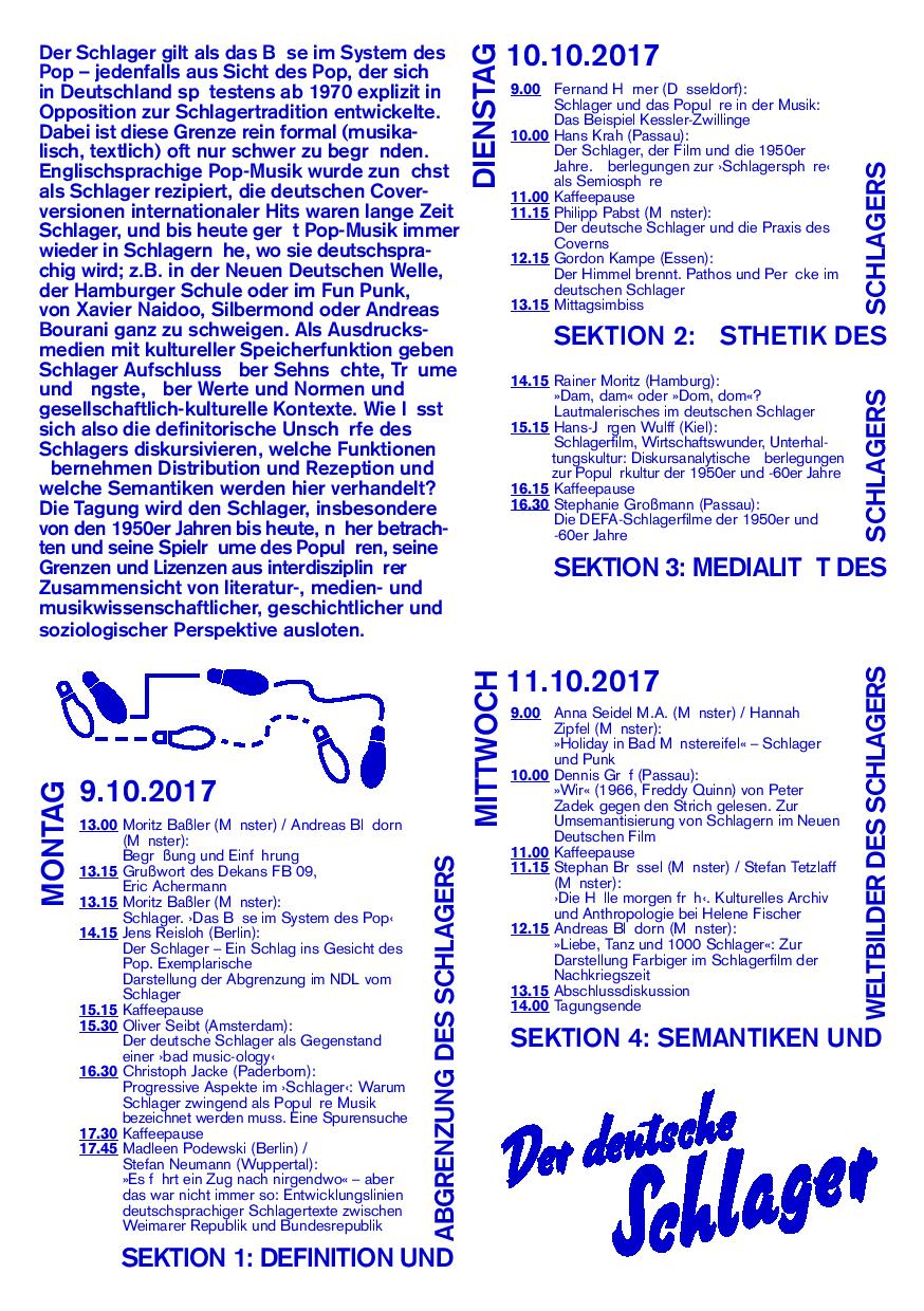 Der Schlager gilt als das Böse im System des Pop. Jedenfalls aus Sicht des Pop, der sich in Deutschland spätestens ab 1970 explizit in Opposition zur Schlagertradition entwickelte. Dabei ist diese Grenze rein formal (musikalisch, textlich) oft nur schwer zu begründen. Englischsprachige Pop-Musik wurde zunächst als Schlager rezipiert, die deutschen Coverversionen internationaler Hits waren lange Zeit Schlager. Und bis heute gerät Pop-Musik immer wieder in Schlagernähe, wenn sie deutschsprachig wird, zum Beispiel in der Neuen Deutschen Welle, der Hamburger Schule oder im Fun Punk - von Xavier Naidoo, Silbermond oder Andreas Bourani ganz zu schweigen. Als Ausdrucksmedien mit kultureller Speicherfunktion geben Schlager Aufschluss über Sehnsüchte, Träume und Ängste, über Werte und Normen und gesellschaftlich-kulturelle Kontexte.