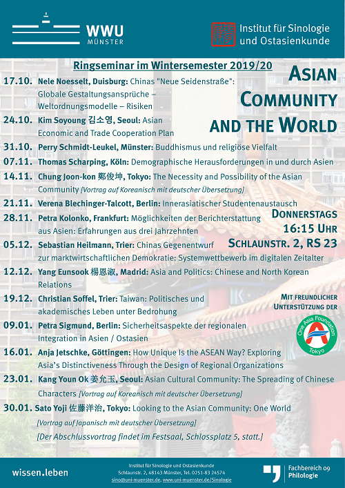 In Kooperation mit der One Asia Foundation, Tokyo, lädt das Institut für Sinologie und Ostasienkunde der WWU Münster im Wintersemester 2019/20 Referentinnen und Referenten aus verschiedenen Bereichen zu einem Ringseminar mit dem Thema "Asian Community and the World" ein. Die Vorträge finden donnerstags um 16.15 Uhr im Seminarraum RS 23, Schlaunstraße 2, statt. Der Abschlussvortrag am 30. Januar 2020 wird davon abweichend im Festsaal, Schlossplatz 5, stattfinden.