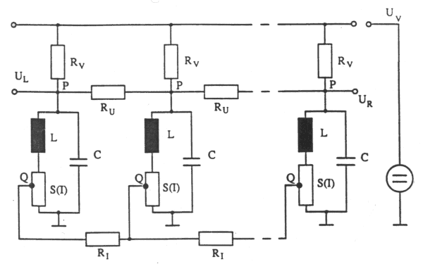Abb. 1: Schaltplan des Systems aus 128 gekoppelten Oszillatoren. RV = 2,4 kOhm, C = 0, L = 33 mH. S(I) ist in Abb. 2 dargestellt, UL und UR wurden nicht angeschlossen