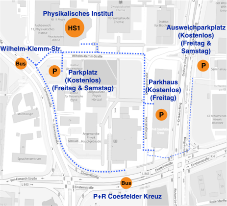 Die Anreise mit dem Auto ist natürlich möglich, allerdings ist zu beachten dass viele Parkplätze im Bereich der Institutsgruppe 1 nur Parkplätze für Mitarbeitende der Universität sind. Wir empfehlen unseren Gästen daher den Parkplatz direkt vor dem Haupteingang der Institutsgruppe 1 zu nehmen, dieser ist für die Dauer des Astroseminars für alle Personen freigegeben (siehe Lageplan ganz unten).