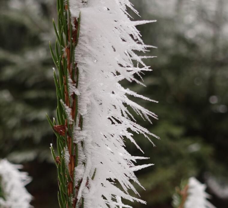 Antwort: Der Gedanke liegt nahe, dass bei der einseitigen Ausrichtung der Eisnadeln der Wind im Spiel sein könnte. Vermutlich würde man dabei davon ausgehen, dass die Kristalle in die windabgewandte Richtung wachsen. Doch es ist genau umgekehrt: Der Wind schafft das "Baumaterial" in Form von unterkühlten Wassertröpfchen heran, und diese kristallisieren sobald sie auf das Hindernis auftreffen. Denn um zu kristallisieren benötigen sie einen Keim, der zunächst unterschiedlichen Ursprungs sein kann. Sobald sich jedoch ein Eiskristall gebildet hat, geht es nur noch darum, an diesen anzudocken und ihn zu vergrößern. Interessanterweise wächst der so entstehende Eiskristall nicht monolithisch dem Wind entgegen, sondern in Form stacheliger Auswüchse. Denn weil beim Andocken und damit verbundenen Kristallisieren der unterkühlten Wassertröpfchen Kristallisationswärme abgegeben werden muss, würde ein kompakter Anbau der Kristalle sofort wieder schmelzen. Daher stellt sich ein eher dendritischer Aufbau der Kristalle mit größtmöglichen Kontakt zur Umgebung ein.