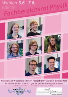 Auf dieser Seite seht ihr die Kandidaten zur Wahl der Fachschaftsvertretung (FSV) Physik und des Fachbereichsrates (FBR). Über eine hohe Wahlbeteiligung würden wir uns dabei freuen, da wir dadurch stärker legitimiert werden und uns besser für euch einsetzen können! Ihr bekommt von uns sogar Wassereis oder ein Freigetränk auf unserem Sommerfest, wenn ihr wählen geht ;-)