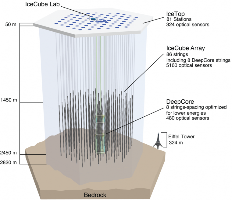 The neutrino detector consists of 86 strings, each equipped with 60 optical sensors (photomultipliers), which instrument a volume of 1 km3 of clear ice at depths between 1500 m and 2500 m at the geographic South Pole. Neutrinos are reconstructed indirectly via the Cherenkov light emitted by charged secondary particles (e.g., electrons and muons) that are produced in neutrino interactions. Further information about the detector, its functioning, and the physics investigated can be found on the IceCube homepage.