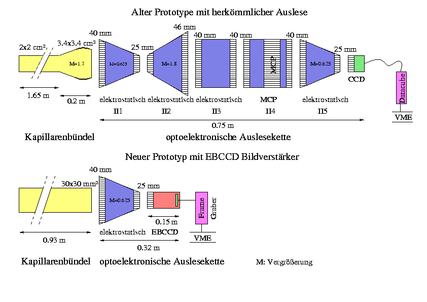 On the top the prototype with the normal optoelectronic chain is displayed. At the bottom the chain with the EBCCD tube can be found. Some advantages of the use of the EBCCD tube are obvious. Less normal image intensifiers are needed, therefore the costs are lower. Also the occupied space is reduced by more then a factor two when used together with a image intensifier.