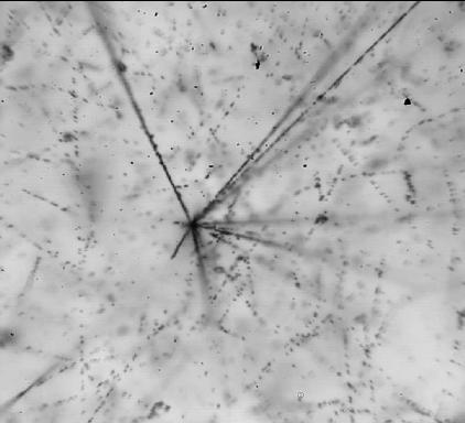 This picture shows a vertex of a neutrino interaction. The interaction occurs in the middle of the "star", the outgoing particles in the layer of the event are nuclear fragments.