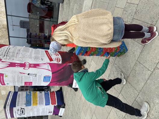 Zur Quark Matter Konferenz 2025 in Frankfurt am Main betreuten wir die Wanderausstellung „Urknall unterwegs“ vor der Goethe-Universität. Neben dem informativen, begehbaren Urknall-Tunnel haben wir gemeinsam Elementarteilchen-Buttons gebastelt, Klemmbaustein-Hadronen zusammengesetzt, ein Quark-Jenga in Lebensgröße und ein Persönlichkeitsquiz vom CERN angeboten. Zu Besuch waren Familien aus Frankfurt, aber auch sehr viele Forschende von der Konferenz. In der Wissenschafts-Community erfreuten sich die Elementarteilchen-Buttons großer Beliebtheit!