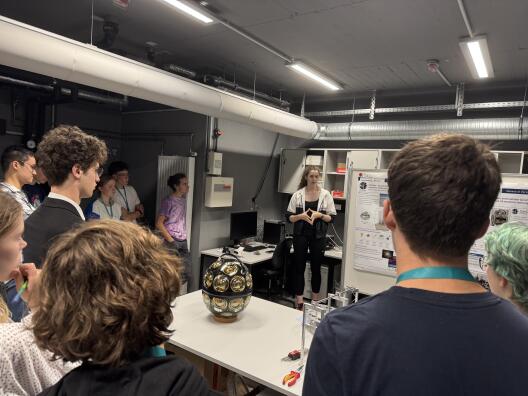 Am 21.07.2025 freuten wir uns über den Besuch der diesjährigen Schülerakademie. Einen Tag lang besuchten sie unser Institut und bekamen so direkte Einblicke in die Forschung. Christian Klein-Bösing führte die Jugendlichen mit einem Einführungstalk in die moderne Grundlagenforschung der Teilchenphysik ein. Ein besonderes Highlight waren die Laborführungen der AG Weinheimer und der AG Kappes. Berit Schlüter, Doktorandin in der IceCube-Kollaboration, gab den Jugendlichen einen Einblick in die Forschung am Südpol.