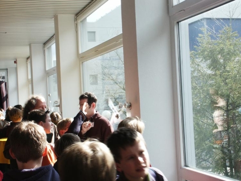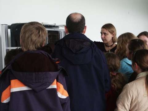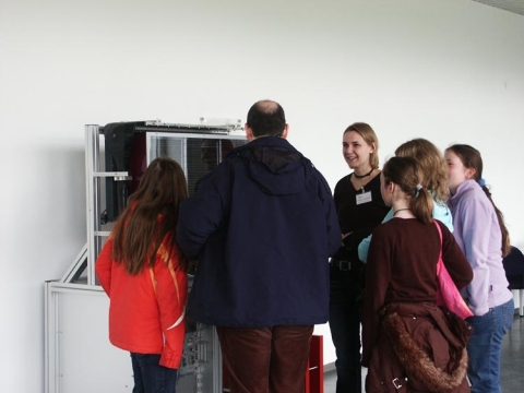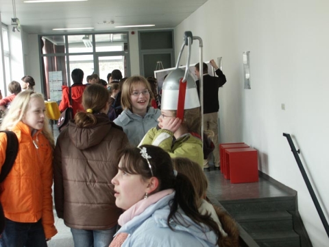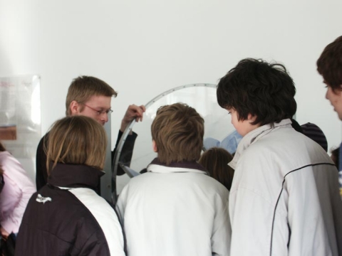 Gespannt warteten die 6 Oberstufenschüler des Rats-Gymnasiums zusammen mit ihrer Lehrerin Frau Ute Luft auf ihren Einsatz: um 10:15 Uhr sollte sie beginnen, ihre Physikshow „Von Pisa bis Plasma“- eine Reise durch die Geschichte der Physik, bespickt mit zahlreichen spannenden und unterhaltsamen Experimenten.