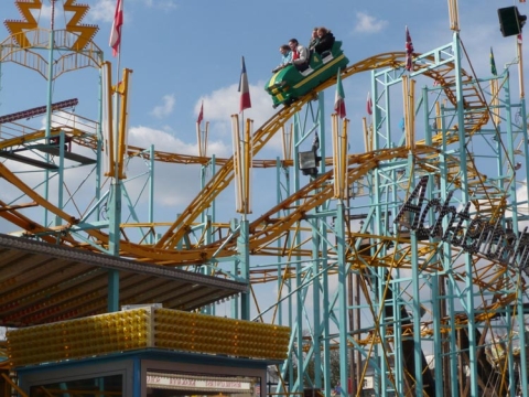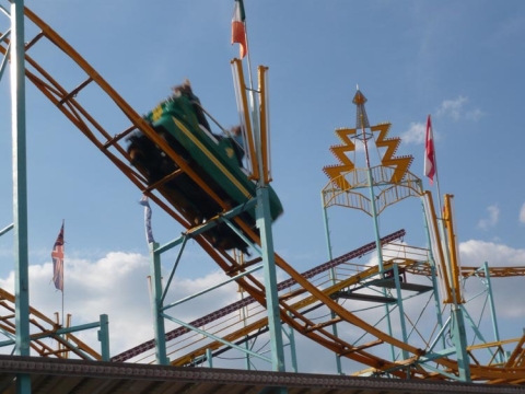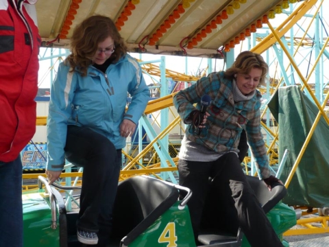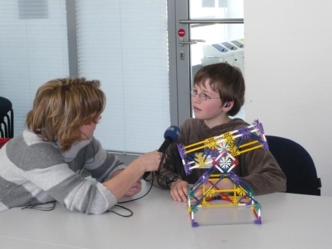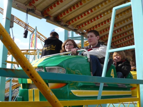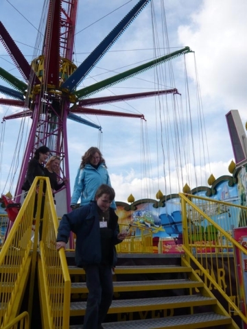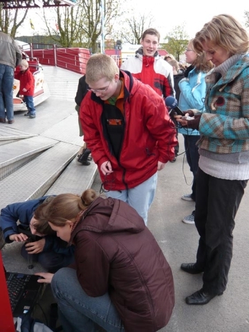 Frau Krings vom WDR hat uns an diesem Tag begleitet. Die Teilnehmerinnen und Teilnehmer haben ihr geduldig die Zusammenhänge von Fliehkräften und Beschleunigungen erklärt, so dass sie sich zuletzt sogar selbst in dessen Fänge während einer Achterbahnfarht begab.