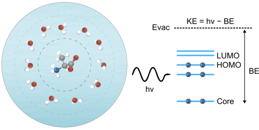 Our group’s goal is to develop and utilize a novel and powerful technique to study chirality in aqueous solutions of amino acids: enantiosensitive liquid-jet photoelectron spectroscopy (LJ-PES). Standard LJ-PES enables the direct study of electronic-structure characterization of molecules in solution with site- and chemical-state specificity. Our group will extend this technique by leveraging phenomena that highlight the photoelectron’s capacity to directly access molecular chirality: photoelectron circular dichroism (PECD) and chirality induced spin selectivity (CISS). Briefly, the former effect describes the asymmetry in the angular distribution and the latter in the spin polarization of photoelectrons generated upon photoionization of chiral systems under specific experimental conditions. The goal of this project is to develop and apply enantiosensitive LJ-PES to target key fundamental and technologically relevant aqueous-phase processes including induced chirality in molecular solvation shells, enantiomer-dependent photolysis and reaction kinetics, and chiral intermolecular recognition.