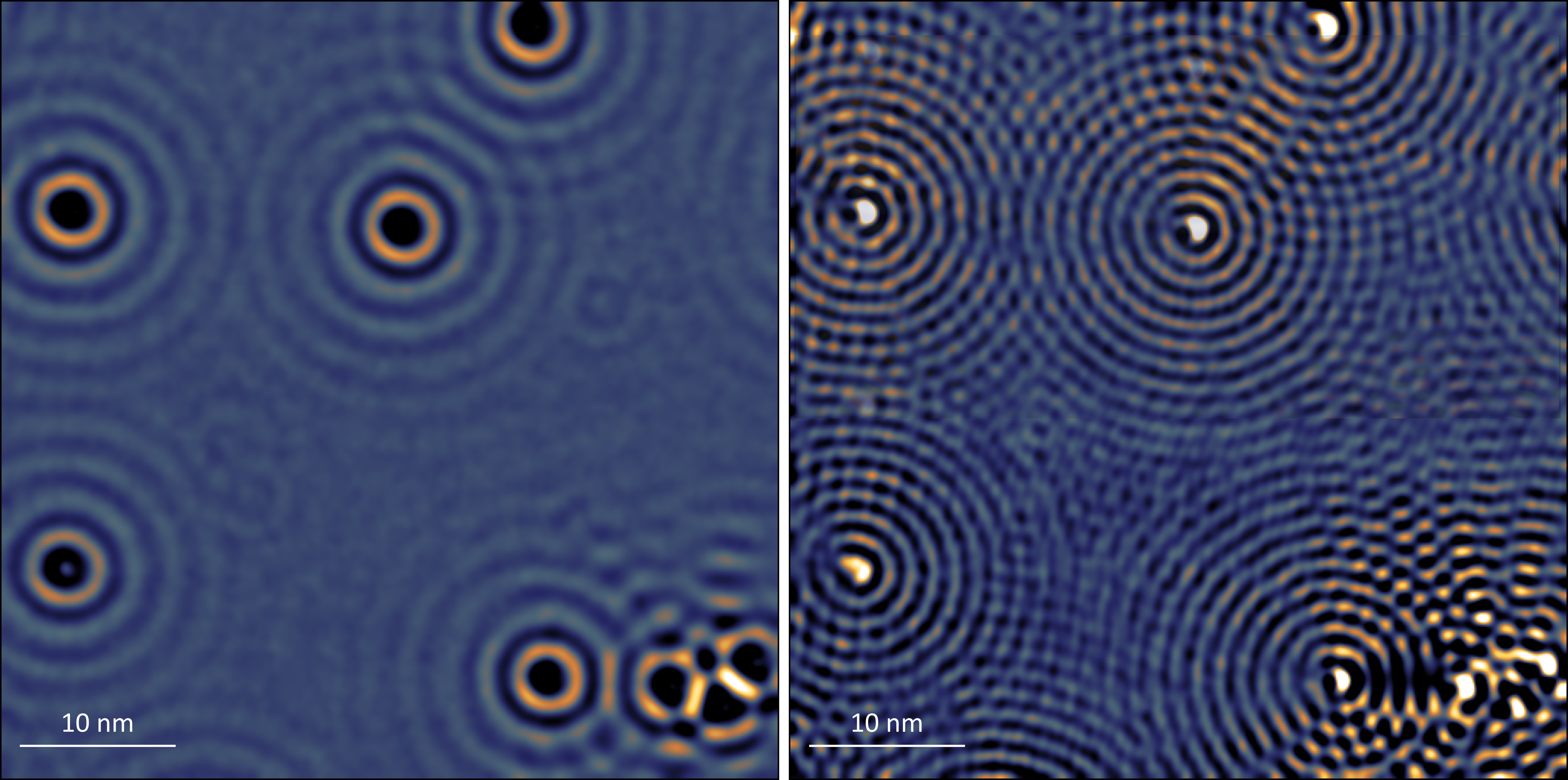 The first spectroscopic maps recorded with our STM after movement. The dI/dU maps recorded at two different bias voltages show standing wave patterns caused by the Cu (111) surface state 2D electron gas scattered at single adsorbates. The data were acquired by students as part of a master’s practical course.
