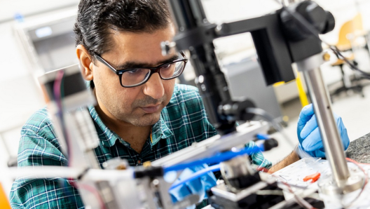 Postdoktorand Dr. Nihit Saigal aus der Arbeitsgruppe von Prof. Dr. Ursula Wurstbauer am Physikalischen Institut der Universität Münster hat im Labor das Zubehör zurechtgelegt, um ein ultradünnes, zweidimensionales Material herzustellen: einen silberfarbenen Kristall aus Molybdändisulfid, eine viskoelastische Polymerfolie – und Klebeband. Vorsichtig legt er den Kristall auf das Klebeband, sodass ein wenig des Materials darauf haften bleibt. Diesen Hauch von Material drückt er mehrfach auf die Polymerfolie, dabei werden die Spuren immer dünner. Unter dem Mikroskop begutachtet er das Ergebnis und sucht eine Stelle, bei der das Molybdändisulfid extrem dünn ist – nämlich möglichst genau eine einzige Moleküllage dick.