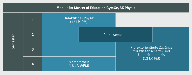 Im Masterstudium steht die Befähigung zum Lehramt im Vordergrund. Aufbauend auf dem Fachwissen aus dem Zwei-Fach-Bachelor-Studium bzw. Bachelor BK haben sich die Studierenden lehramtsspezifische Kompetenzen angeeignet. Sie beherrschen die Methoden und die wesentlichen theoretischen Grundlagen der Unterrichtsplanung und -gestaltung. Sie verfügen über die Voraussetzung für differenzierte fachdidaktische Studien. Sie sind für das Aufspüren physikalischer Sachverhalte in außerphysikalischen Kontexten sensibilisiert. Diese können sie fachlich durchdringen und auf typische Lernschwierigkeiten hin analysieren. Darauf aufbauend sind sie in der Lage, diese Sachverhalte für den Unterricht zu elementarisieren. Sie können eigenständig komplexe Zusammenhänge der neueren Physik adressatenspezifisch und anschlussfähig vereinfachen, illustrieren und auf konkreten Physikunterricht bezogen darstellen. Sie verfügen über Kenntnisse und Fertigkeiten im schulorientierten Experimentieren sowie über die Handhabung und die Einsatzmöglichkeiten einer schultypischen Gerätesammlung. Sie sind mit realistischen Anforderungen des Experiments als Erkenntnismethode der Physik vertraut. Sie sind dazu in der Lage, theoriegeleitete Erkundungen im Handlungsfeld Schule zu planen, durchzuführen und auszuwerten. Im Praxissemester haben die Studierenden das Arbeitsfeld Schule kennen gelernt und sich kommunikative Kompetenzen im Umgang zwischen Lehrenden und Schülerinnen und Schülern sowohl im regulären als auch im inklusionsorientierten Unterricht angeeignet.