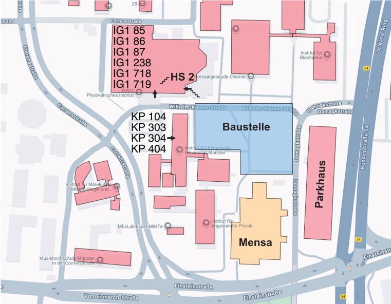 Die Präsenzveranstaltungen finden in den Räumen des Fachbereichs Physik, Wilhelm-Klemm-Straße 9 und 10 (48149 Münster) statt (Lageplan):