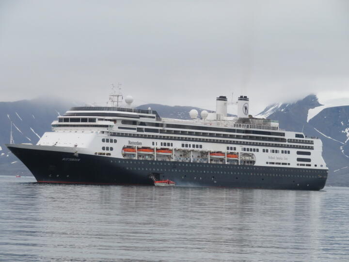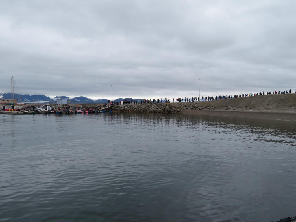 „AWIPEV, AWIPEV, AWIPEV. This is Harry. We are leaving Corbel for Ny-Alesund”. Und schon sind wir unterwegs. Matteo und ich fahren auf ein großes Kreuzfahrtschiff zu, die „Rotterdam“. Selbst heute Morgen hat man sie schon vor Ny-Alesund liegen sehen und die Passagiere werden seit Stunden mit den Rettungsbooten zum Hafen gebracht und wieder abgeholt. Zusätzlich kreuzten heute Morgen zwei weitere kleinere Kreuzfahrtschiffe im Fjord. Als wir uns Ny-Alesund nähern, wird die „Rotterdam“ größer und größer und uns schwant, warum sie nicht am Dock liegt. Dafür sehen wir eine endlose Schlange an Leuten, die darauf warten, wieder auf das Schiff zu kommen. Vom Steg an dem die AWIPEV Boote liegen, bis hoch zum Marinelab, geht die Schlange. Ganz zu schweigen von den Unmengen an Leuten, die durch Ny-Alesund wuseln. Matteo und ich verstehen die Welt nicht mehr. Ganz witzig ist auch die Ausstattung der Touristen, die von Shorts und T-Shirt bis zur Daunenjacke und Polarstiefeln reicht. Wir schauen, dass wir möglichst schnell zum blauen Haus kommen. Dort schicke ich noch den Blog der letzten Tage ab und Matteo trifft seine Reisevorbereitungen.