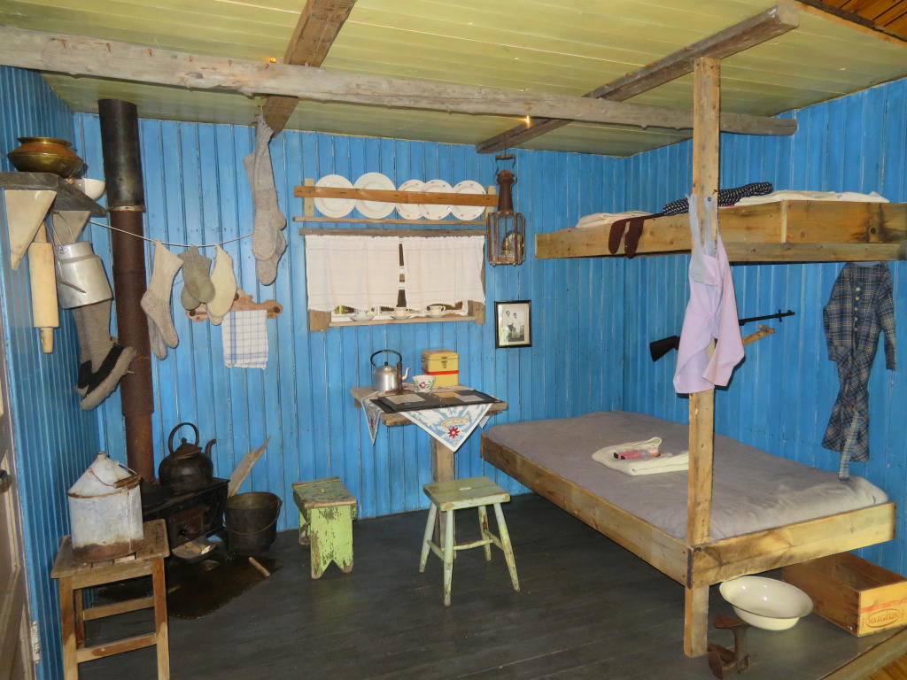 Nachgebaute Trapper-Hütte von Innen. Unsere Hütten waren sehr ähnlich und alle Hütten folgen mehr oder weniger dem gleichen Ausstattungsprinzip mit Holzofen und Stockbetten.© KOP 132 SPLAM