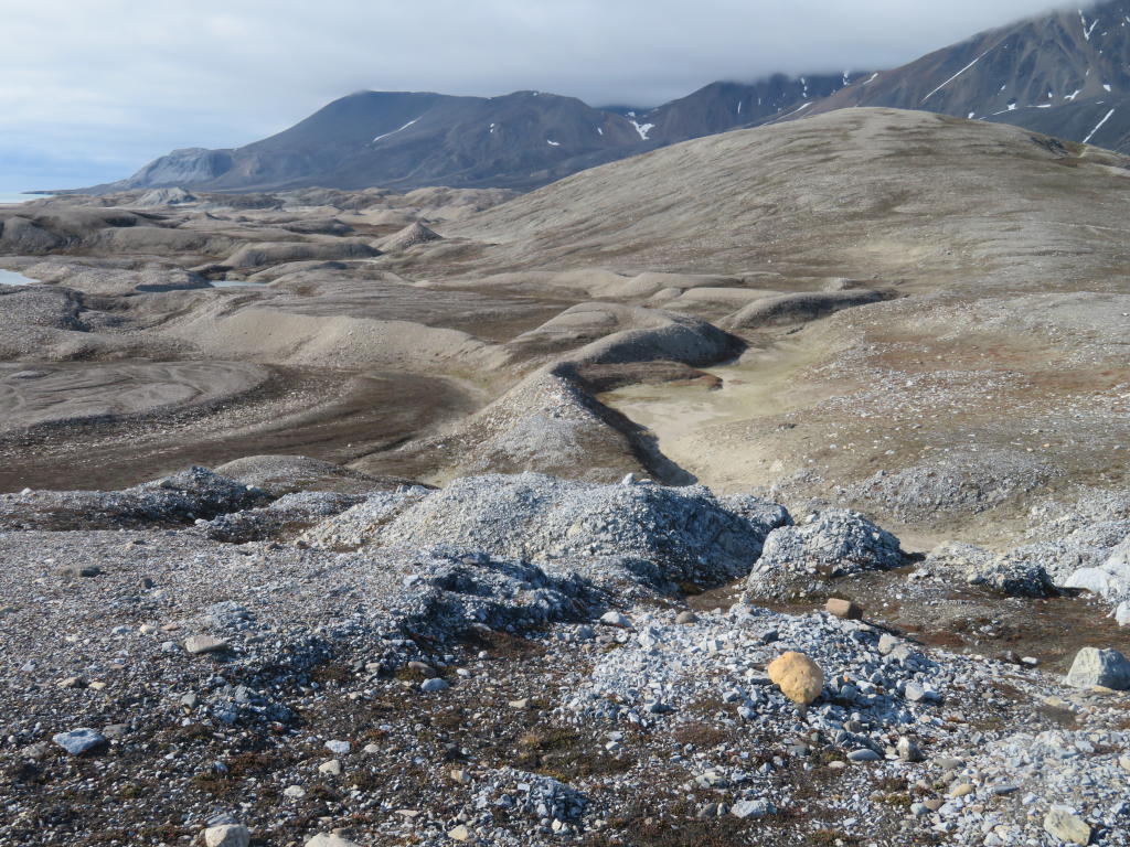 Mit diesen Vorsätzen ziehen wir los, um mehrere Hügel zu untersuchen, die aus schluffig-tonigem Material bestehen – ganz anders als die anderen Hügel hier, die aus Schotter bestehen. Es schaut so aus, als ob diese Hügel nach oben gedrückt wurden, denn am Fuss dieser Hügel und am Gipfel finden wir noch Schotterreste. Dann geht es weiter zu dem Esker, den wir bereits letztes Jahr angeschaut hatten und schließlich auf den Hügel aus anstehendem Gestein, von wo man einen fantastischen Überblick über die Gletscher hier hat. Wir sehen auch wieder, dass unterhalb der Oberfläche, in ca. 1 m Tiefe, reines Gletschereis vorhanden ist. Man ist sich meist gar nicht bewusst, dass man oft auf dem Gletschereis umher wandert und nicht auf solidem Grund. Aber nur etwas „Dreck“ auf dem Eis genügt, und schon meint man, dass alles fest und solide ist. Ist es eben aber nicht!