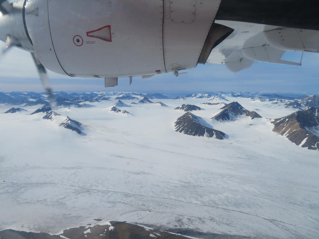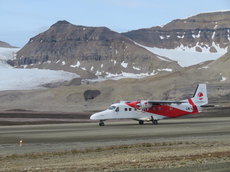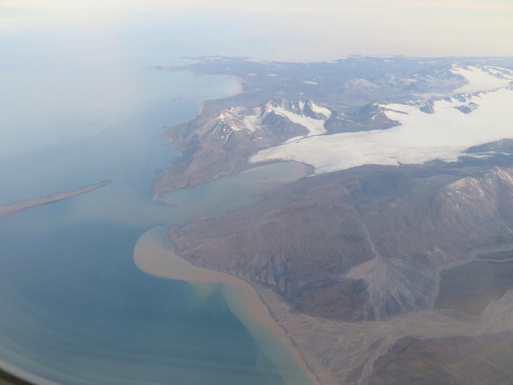 Wir haben heute - wie verabredet - um 7:00 Uhr gefrühstückt und sind tatsächlich um 8:04 Uhr von unserem Taxi abgeholt worden. Wir sind so schnell am Flughafen, dass „Lufttransporten“ noch nicht einmal geöffnet hat. So stehen wir mit ein paar Chinesen vor dem Flughafen und warten, dass es endlich losgeht. Unser gesamtes Gepäck kommt auf eine große Waage und ich frage mich, wie wir das später auseinander dividieren sollen. Danach gibt es noch eine Tasse Kaffee aus der Maschine, die nicht unbedingt Gefallen bei Matteo findet. Jedenfalls winkt er nur ab, als ich ihn frage, wie ihm der Kaffee geschmeckt hat. Dann können wir auch schon einsteigen und ich kriege den Platz direkt hinter den Piloten. Wir machen uns eigentlich keine Hoffnung, irgendetwas zu sehen denn die Wolkendecke ist relativ dicht und niedrig. Wie immer wackelt und vibriert das Flugzeug wenn bei angezogenen Bremsen die Motoren hochgedreht werden. Ich kenne das zwar schon aus den letzten Jahren, es fasziniert mich aber immer wieder aufs Neue. Wir beschleunigen und kurze Zeit später so tauchen wir auch erst in ein dickes Wattepack ein. Aber schon nach ein paar Höhenmetern sind wir durch und es empfängt uns strahlend blauer Himmel und einige höhere Berge, die durch die Wolkendecke schauen. Ein wirklich schöner Anblick, der aber schon wenig später durch fantastische Ausblicke relativiert wird. Je näher wir nach Ny Alesund kommen, desto bessern wird das Wetter und desto geringer wird die Wolkendecke. Schließlich sehen wir tolle Gletscher, schroffe Berge, Deltas und jede Menge anderer morphologischer Strukturen. Einfach nur genial! Und selbst das wird noch übertroffen, da die Flugroute genau über unsere Seitenmoräne führt, die wir seit Jahren untersuchen. Wir bekommen einen guten Blick darauf und können viele Fotos machen. Seit Jahren haben wir immer darauf gehofft Luftbilder zu bekommen und nie hat es geklappt. Aber heute war unser Tag. Wir sehen sofort, dass sich die in den vergangenen Jahren untersuchte Erosionsstruktur erneut drastisch verändert hat. Andere Strukturen zeigen keine neue aktive Erosion, es gibt auch viele neue Erosionsstrukturen. Schon im Flugzeug brennen wir darauf, in dieses Gelände zu kommen. Auch Corbel kriegen wir aus der Lift zu sehen. Schaut eigentlich aus wie immer.