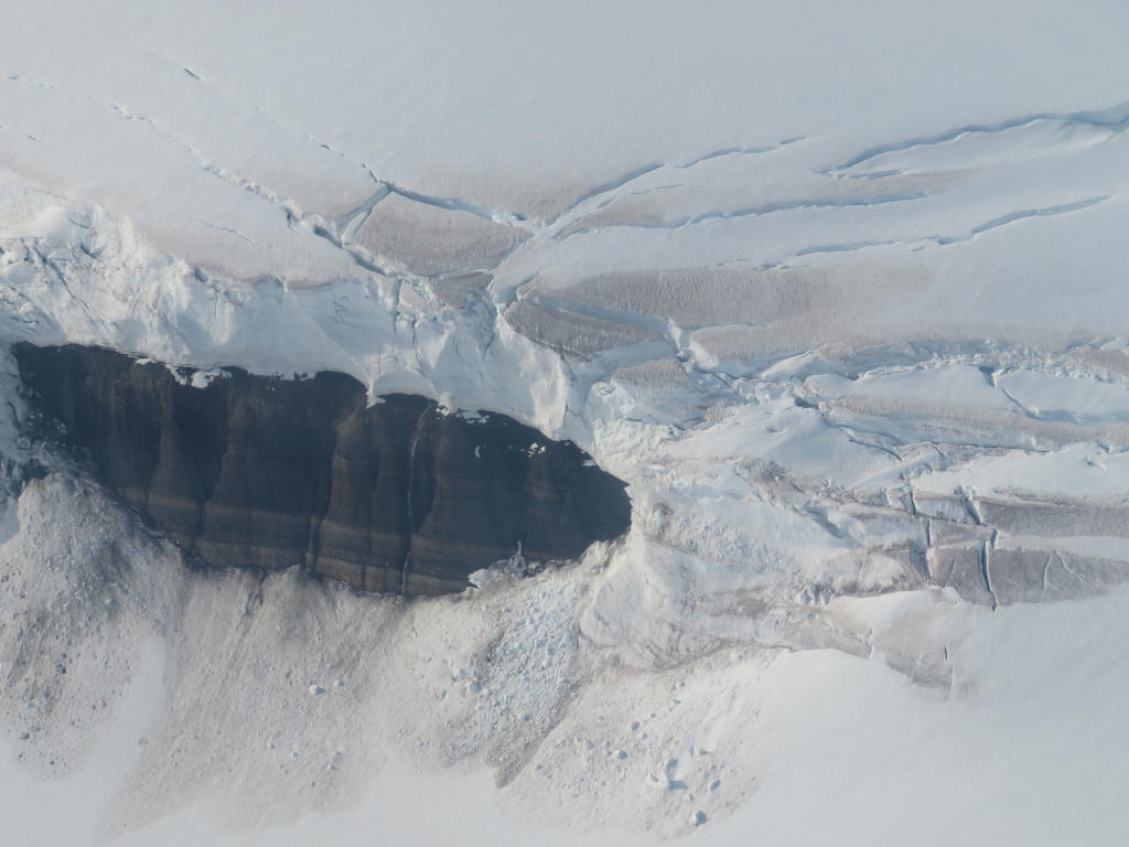 Noch mehr Gletscherspalten und geschichtete Gesteine. Im Hintergrund liegen sie mehr oder weniger söhlig, im Vordergrund wurden sie stark verfaltet© KOP 132 SPLAM
