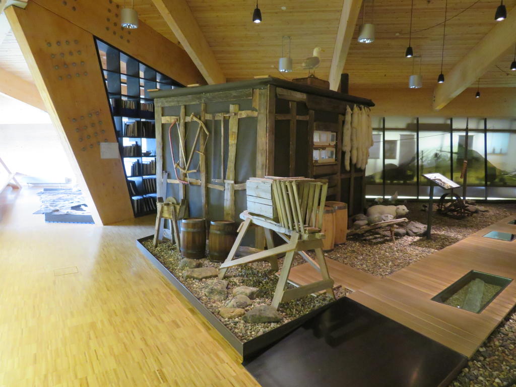 Das Taxi bringt uns zu Mary-Anns Polarrigg, wo wir zwei Zimmer reserviert haben. Wir brauchen die Zimmer zwar nur für ein paar Stunden. Es ist aber immer angenehm, wenn man noch etwas ausspannen kann und sein Gepäck unterbringen kann. Nachdem wir unsere Zimmer bezogen haben, wollen die anderen noch zum Buchladen am Museum. Jan und ich hatten ihn ja schon am ersten Tag ausgekundschaftet und gehen stattdessen ins Museum. Das Museum ist nett gemacht, aber den Eintrittspreis von 90 Kronen (ca. 9 Euro) finde ich etwas überteuert. Neben der Tier- und Pflanzenwelt werden die Geschichte, die bergbauliche Entwicklung und andere interessante Infos dargestellt. Wie gesagt, alles gut aufbereitet, aber etwas mehr Tiefgang und detailliertere Informationen wären schon schön gewesen.