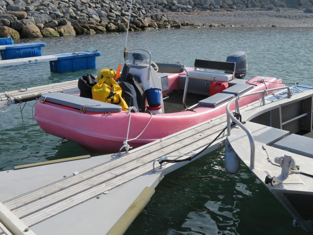 Die „Europa“ liegt noch immer an der Mole und wenn man in einem kleinen Schlauchboot nahe daran vorbei fährt, kriegt man erst ein Gespür für die Dimensionen eines Kreuzfahrtschiffs. Und dieses ist ja noch relativ klein! Jedenfalls schauen uns die Passagiere von oben zu – mit einer Mischung aus Neugierde und Verständnislosigkeit. Wir geben aber auch wahrscheinlich ein absonderliches Bild ab. Jedenfalls werden wir zig-Mal fotografiert. Wir legen am Dock des Marinelabs an und laden unser Gepäck aus. Als alles auf einem Berg liegt, bin ich selbst erstaunt, dass das alles ins Boot gepasst hat. Ich verpasse dem Boot noch ein paar Streicheleinheiten, tanke es auf, fülle Öl nach und schöpfe Wasser. Währenddessen legt die Europa ab und die „Hondius“ legt kaum 20 Minuten später an. Die Kreuzfahrtschiffe geben sich hier praktisch die Klinke in die Hand. Wir beladen das Elektroauto „Goupil“ und zwei Mädels kutschieren unser Hab und Gut zum Rabot-Gebäude weil sie eh dorthin wollten. Die Waffen sind schnell zurück gebracht und so können wir anfangen, Goupil wieder auszuladen. Wir sind fertig als Ernst und Jan um die Ecke biegen. Perfektes Timing! Wir lassen Raphaelle kurz wissen, wo das Boot liegt und dass es wieder voll einsatzfähig ist und sie zeigt uns im Gegenzug Fotos von Sabrinas Propeller. Jemand ist bei hoher Geschwindigkeit über einen Eisbrocken gedonnert und jetzt fehlen die drei Spitzen des Propellers. Totalschaden! Ich bin froh, dass wir die gesamte ausgeliehene Ausrüstung wieder heil zurückgeben können und dass wir keine Probleme mit unserem Schlauchboot hatten.