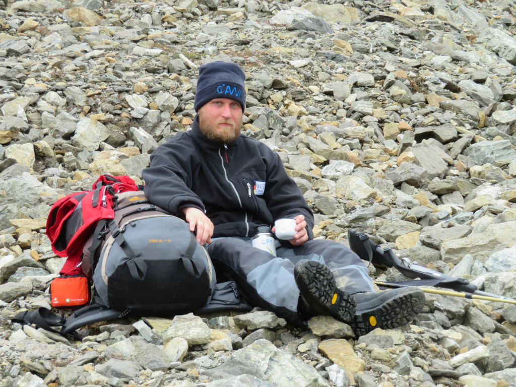 Ernst, Matteo und ich gehen im Regen zur Geopol-Hütte zurück, wo wir noch Tee kochen, die Bayernfahne feierlich einholen und die Hütte sauber Machen, bevor es auf unsere Wanderung zur Daerten-Hütte geht. Wir planen so um die 5 Stunden Fußweg ein. Mittlerweile ist das Wetter wieder besser, aber es weht uns ein starker und kalter Wind entgegen. Der Marsch wird also kein Vergnügen. Und so ist es dann auch. Durch das Laufen kommen wir gut ins Schwitzen aber wir können unsere roten Jacken nicht aufmachen, weil es einfach viel zu kalt ist und man dann nur krank werden würde.