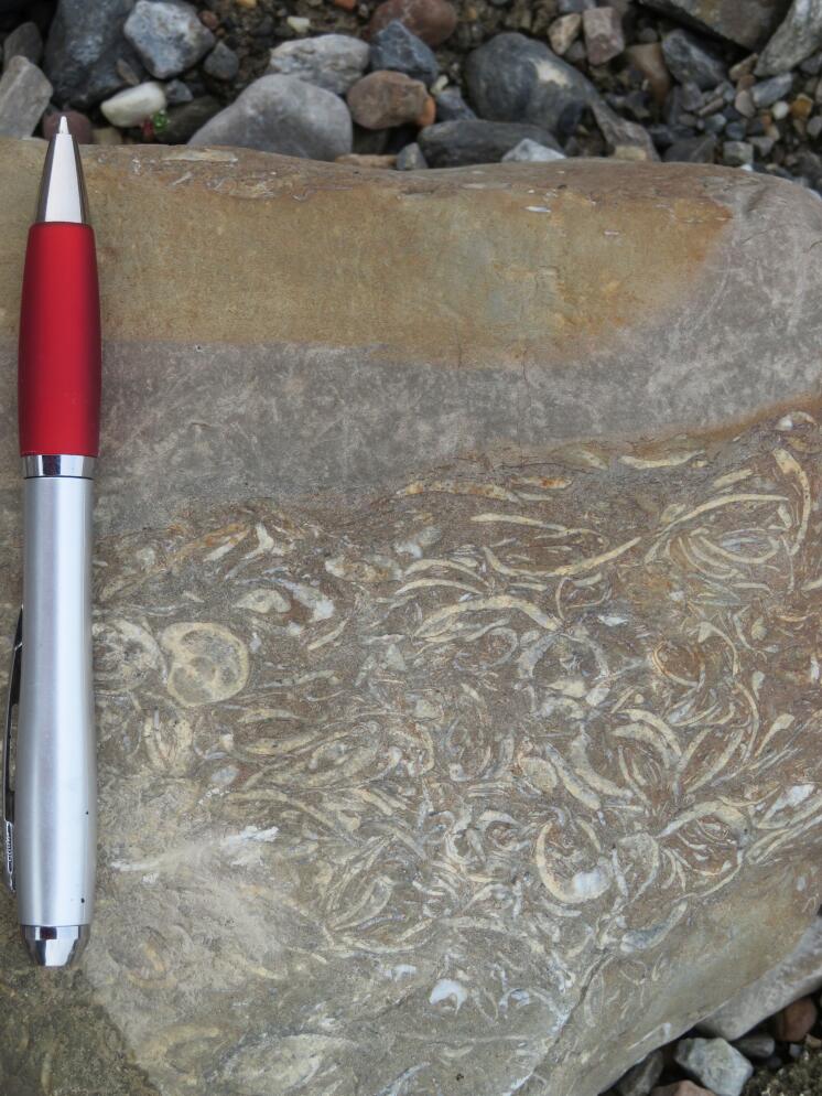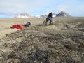 Ernst und ich beschäftigen uns heute zuerst mit dem Aussuchen und Beschreiben weiterer Referenzpunkte. Am Ende haben wir insgesamt 50 Referenzpunkte über das Untersuchungsgebiet verteilt. Für jeden machen wir eine vorläufige GPS Messung, Fotos aus mehreren Blickrichtungen und eine Beschreibung des Gesteinsblock: Farbe, Rundungsgrad, Lithologie, Größe, Beschreibung der Umgebung, ob er im Wasser liegt oder auf hartem Boden, ob er teilweise von Schutt überdeckt ist, ob das Gebiet aktuell deformiert wird und andere Beobachtungen, die uns nächstes Jahr helfen werden, den Gesteinsbrocken eindeutig wiedererkennen zu können. Das nimmt deutlich mehr Zeit in Anspruch als wir uns das gedacht haben. Währenddessen macht Andreas die Pole-Bilder und Jan hält wie gesagt Wache. Der Bauch knurrt bereits, als Ernst und ich fertig sind und zu den anderen stoßen, die nun zu zweit auf unserem Wachhügel sitzen und dort oben Brotzeit machen. Die zwei Alten aus der Muppet-Show lassen grüßen!