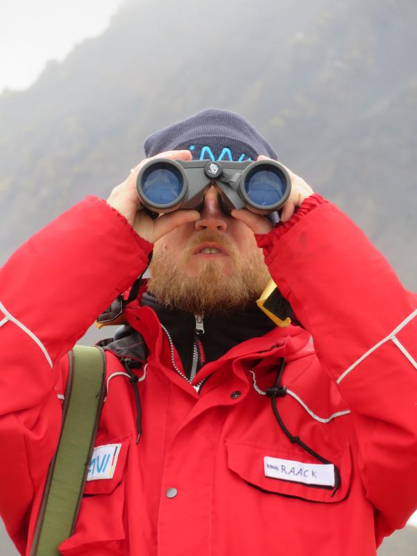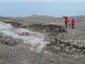Das Wasser ist heute sehr ruhig und wir kommen schnell in unserem Untersuchungsgebiet an. Nach der üblichen und schon zur Routine gewordenen Umziehaktion müssen wir heute als erstes unsere Alukiste und die zwei Koffer mit dem DGPS bis zu unserer Erosionsstruktur hochschleppen. Im unwegsamen und teilweise matschigen Gelände ist es gar nicht so einfach, zu zweit eine große Kiste einen steilen Hang hoch zu tragen. Aber wir sind ja wahre Polarhelden und schaffen auch das! Wie schon gestern, werden wir auch heute immer einen zur Wache abkommandieren. Eine prima Sache - man steht auf einem Hügel und wird kalt! Wir wechseln uns also mehr oder weniger regelmäßig ab. So kann der Rest der Mannschaft wenigstens sicher und ruhig arbeiten. Auf dem Programm steht heute neue Pole-Bilder zu machen, die Referenzpunkte mit dem DGPS einzumessen, andere Bilder zu machen, die IR-Kamera wieder zu nutzen und auch möglichst viele andere Punkte mit dem DGPS zu vermessen. Insgesamt haben wir 25 neue Referenzpunkte eingemessen, fotografiert und im Feldbuch beschrieben. Unsere Hoffnung ist, dass wir eventuell nächstes Jahr sehen können, wie die gesamte Moräne sich verändert. Ob sie z.B. insgesamt abtaut und niedriger wird oder einzelne Teilbereiche sich innerhalb eines Jahres gegeneinander bewegen. Wir werden uns also bis nächstes Jahr gedulden müssen, bevor wir sagen können, ob unser Experiment erfolgreich ist. Gegenüber den letzten Tagen hat sich unsere Erosionsstruktur nochmals deutlich verändert. So haben sich viele neue Spalten entlang der Abbruchkante gebildet und wenn wir Glück haben, werden diese Blöcke vielleicht noch bis Morgen abbrechen und wir dies in den Zeitrafferbildern festhalten können. Mehrmals während des heutigen Tages war ein dumpfes Geräusch zu hören, wenn solche Blöcke in den Matsch gefallen sind. Interessant ist auch, dass selbst kleine Spalten in ihrem Inneren deutlich kälter sind als die Oberfläche. Tiefe Spalten haben an ihrem Boden nur etwas über 0 Grad Celsius, während die Oberfläche ca. 5-7 Grad warm ist.