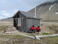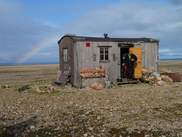 Um kurz nach 18:00Uhr sind wir an der Hütte und Jan und Andreas begrüßen uns mit einem Whiskey. Die perfekte Begrüßung! Ernst und ich beschließen die Zeit zu nutzen solange wir noch warm vom Wandern sind, um etwas Körperpflege zu betreiben. Sprich, wir gehen kurz ins Meer und waschen uns dann an einem kleinen Bach. Im Wind ist das nicht sehr spaßig, aber es fühlt sich „saugut“ an, wieder sauber zu sein. Oder zumindest etwas sauberer zu sein. Und so kalt war es eigentlich gar nicht. Nicht für wahre „Polar Heroes“! Wieder warm und trocken diskutieren wir den Plan für die nächsten Tage. Raphaelle gibt uns den Wetterbericht durch, der windiges aber trockenes Wetter für morgen vorhersagt. Alles im grünen Bereich. Gekrönt wird der Tag von einem thailändischen Gericht, das uns Andreas bereitet. Erstaunlich, was er in der winzigen Küche mit einem Zweiflammenkocher und vier hungrigen Kerlen, die um ihn rumstehen, so fertig kriegt. Das Buch „Goldrausch in Alaska“ das Ralf letztes Jahr hier zurück gelassen hat ist noch immer da und wird sofort gelesen. Alternativ dazu gibt es die üblichen VI-Menn Magazine, die aber deutlich weniger anspruchsvoll sind. Die Betten sind schnell verteilt: Andreas und Ernst werden wie letztes Jahr das „Doppelbett“ teilen, Matteo schläft im oberen Stockbett, Jan auf dem Sofa und ich nehme den Boden. Somit geht ein guter Tag dem Ende zu und wir freuen uns auf Morgen, wenn wir einen Hügel mit Eiskern genauer untersuchen wollen.