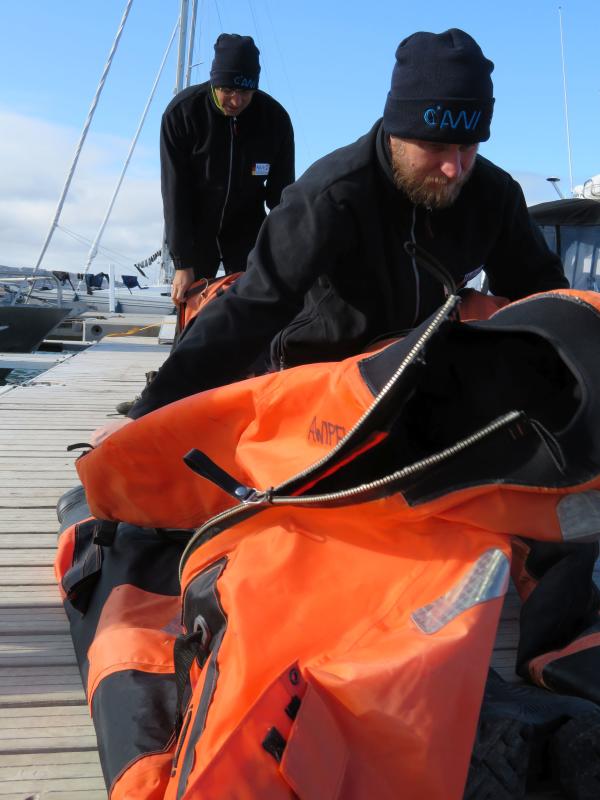 Das war es mit der Geländearbeit in diesem Jahr: Anziehen der Überlebensanzüge für die Rückfahrt zur Corbel-Hütte© KOP 132 SPLAM