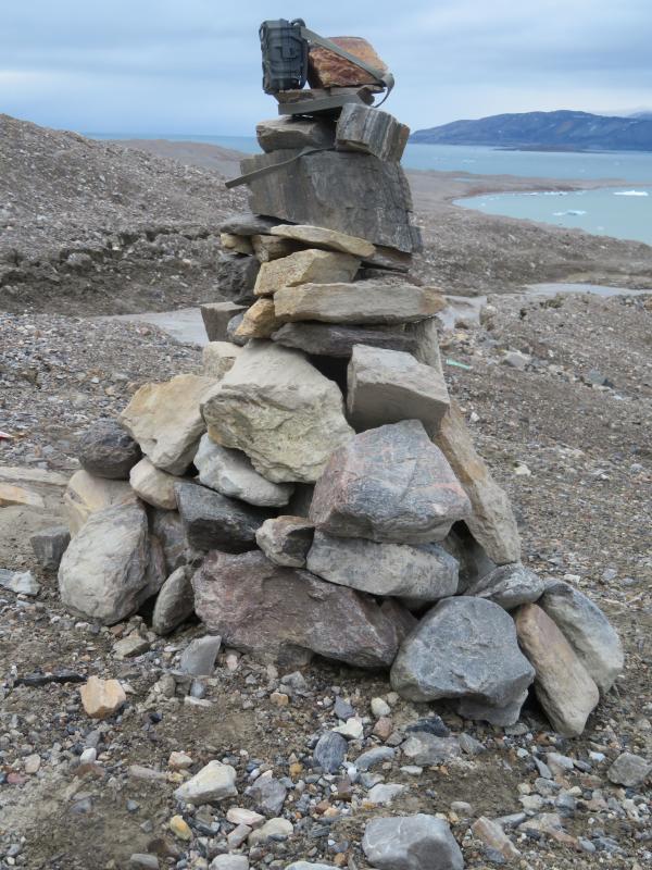 Kein Bär weit und breit in Sicht, also können wir an Land gehen. Gewehre teilladen, Überlebensanzüge runter, Rucksäcke rauf! Es ist ungewöhnlich warm und die Sonne scheint, als wir im Untersuchungsgebiet ankommen. Zuerst nehmen wir die zwei Erosionsstrukturen unter die Lupe, die wir heute Morgen vom Flugzeug aus gesehen haben. Nach einer kurzen Diskussion entscheiden wir, die Zeitrafferkameras wieder an jener Struktur aufzubauen, die wir bereits in den vergangenen Jahren beobachtet haben. Wir schätzen, dass sich die Abbruchkante seit unserem Besuch in 2018 um weitere 5-6 m hangaufwärts bewegt hat. Wir schleppen Steine und Ernst baut daraus einen schönen und super massiven Steinmann für seine Kamera. Ich stelle meine gegenüber auf, so dass wir alles im Blick haben sollten. Jan und Andreas legen die Referenzmarken für die Bilder aus und Matteo ist mit Notizen machen beschäftigt während ich die Referenzpunkte mit dem GPS einmesse und Fotos mache. Alles klappt wie am Schnürchen und Jan kann noch mehr als 400 Bilder aus ca. 3 m Höhe Machen, die wir dann zu einem Mosaik zusammensetzen werden. Wir werden diese Prozedur in den nächsten Tagen mehrmals wiederholen, um damit feststellen zu können, wie schnell sich die Erosionsstruktur verändert. Wir funken noch schnell Raphaelle an, da wir den Termin mit ihr nicht einhalten werden können, bevor wir wieder mit Volldampf Richtung Corbel fahren. Absolut glattes Wasser macht die Fahrt zu einem Vergnügen. Auch das Ankern klappt auf Anhieb und so kann uns Raphaelle in die neue Wasserversorgung einweisen bevor uns Andreas ein hervorragendes Essen aus den wenigen Dingen zaubert, die wir mitgebracht haben. Abgeschlossen wird unser Abendessen mit einem Lavazza Espresso. Mittlerweile sind Wolken aufgezogen aber es ist noch immer warm und freundlich.