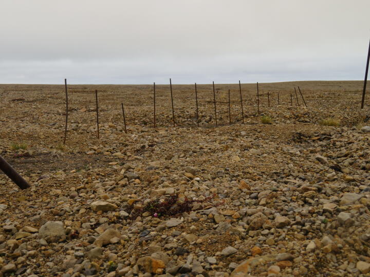 Matteo, Ernst und ich kämpfen uns bis zum letzten markierten Steinkreis. Dieses Jahr ist das Profilablaufen schon fast langweilig, da wir von keinem Eisbären gestört werden. Aber ich habe dieses Jahr wesentlich mehr Ausschau gehalten, als letztes Jahr. Man lernt halt auch dazu! Mittlerweile regnet es so stark, dass an ein vernünftiges Arbeit nicht mehr zu denken ist. Angesichts des Wetters und der fortgeschrittenen Zeit, gehen wir zu Geopol zurück. Auf den ganzen Weg bis zum letzten Steinkreis war es uns immer kalt, aber kaum sind wir ein paar Meter nach dem Umdrehen gelaufen, wird uns auch schon richtig warm. Also Fleece runter! Auf dem Rückweg kommen wir noch an unserem ersten Versuchsaufbau vorbei. Vor mittlerweile zwei Jahren haben wir über einen Steinkreis in regelmäßigen Abständen einen Meter lange Eisenstangen in den Boden gehauen. Auf diese Art wollten wir sehen, wie sich das Innere und das Äußere der Steinkreise unterschiedlich stark heben, wenn der Boden gefriert. Leider ergibt sich kein eindeutiges Ergebnis, aber wir haben ja noch einen zweiten Versuchsaufbau, bei dem wir schon letztes Jahr sehr interessante Beobachtungen machen konnten.