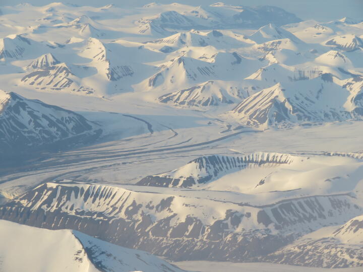 Der Flug macht den ganzen Stress wieder wett. Wir haben sonniges Wetter und man sieht die Landschaft unter uns ohne jede Wolke vorbei ziehen. Meine Kamera klickt vor sich hin und im Prinzip hätte ich auch einen Film drehen können. Es ist absolut fantastisch! Erosionsrinnen, Gletscherspalten, Toteislöcher, Moränen, Schneefelder, Schichtung und tektonische Verfaltung in den steilen Gebirgshängen, Schmelzwasserbäche und Seen auf den Gletschern und vieles mehr können wir heute sehen. Dadurch, dass unser kleines Flugzeug auch sehr tief fliegt, hat man fast das Gefühl, dass sie Berge höher sind als unsere Flughöhe. Aber das ist natürlich nicht richtig und ich bin auch ganz froh darüber. Jedenfalls gestaltet sich der Flug zu einem Crash-Kurs in glazialer Geomorphologie und vergeht wie „im Fluge“. Grandioser Kalauer erster Güte! Der einzige Wermutstropfen ist die Flugroute kurz nach dem Start. Unser Untersuchungsgebiet auf der Kongsvegen/Kronebreen Seitenmoräne wird genau überflogen, so dass man es weder von der rechten noch von der linken Sitzreihe sehen kann. Zu schade! Aber das ist jetzt schon wirklich jammern auf allerhöchstem Niveau. Es ist zu schade, dass nach ca. 20 Minuten bereits alles vorbei ist. Von mir aus hätte ich gerne noch länger fliegen können! Wir sitzen noch im Flugzeug, die Motoren laufen noch und um mich herum fummelt jeder an seinen Handys herum. Warum eigentlich? Mir ist das Ding keine Minute abgegangen und ich bin auch gar nicht so scharf darauf zu erfahren, wer wieder was - am besten schon gestern - von mir haben will. Auch in der Beziehung waren die letzten zwei Wochen sehr entspannend und entschleunigend.