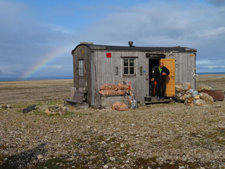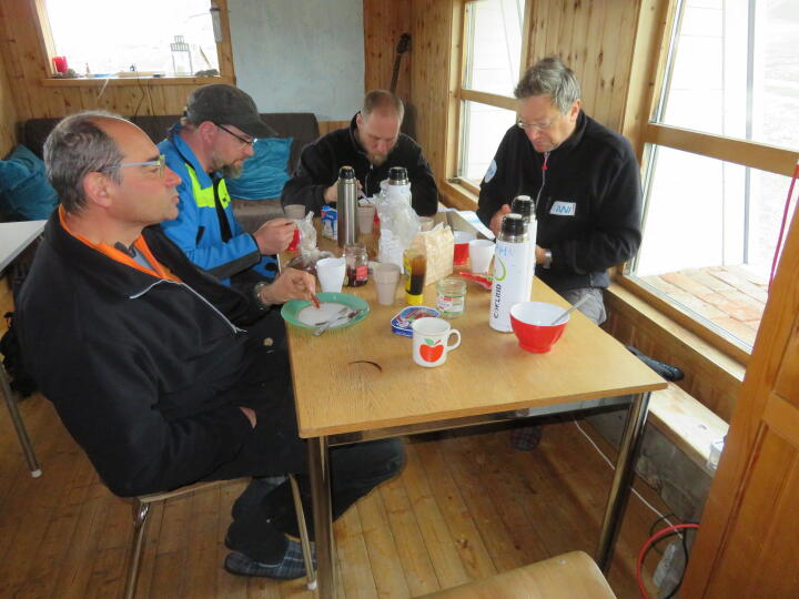 Ich wache um 7:11 Uhr auf und Ernst ist bereits wach. Den Wecker habe ich nicht gehört und auch die anderen schlafen noch. Der Wetterbericht ist zutreffend und wir haben zum ersten Mal Sonne zu Frühstück. Genial! Heute ist also schon wieder der Tag des Abschieds von der Geopol-Hütte gekommen. Ich bedauere das immer sehr, denn der Aufenthalt in dieser Hütte ist für mich immer ein Highlight. Ich liebe diese Hütte einfach und bin jedes Mal traurig, wenn wir weiter ziehen. Ich glaube ich könnte ohne Probleme mindestens 14 Tage dort verbringen. Es ist die Abgeschiedenheit und der gute Grundriss der Hütte, die mir gefallen. Und sie ist einfach sehr gemütlich. Ich stelle mir vor, wie es wohl im Winter wäre, von hier aus die Polarlichter zu beobachten, oder im Frühjahr, wenn das erste Licht wieder da ist. Das muss einfach genial sein.