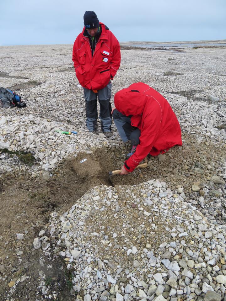 Wir haben uns für heute ein volles Programm ausgedacht. Jan und Andreas werden sog. Polebilder machen, also Bilder aus ca. 3 m Höhe, während Ernst, Matteo und ich die Eisenstangen inspizieren wollen, die wir vor zwei Jahren ca. 90cm tief in den Boden gehauen haben. Die Stangen werden mit der Frosthebung unterschiedlich stark aus dem Boden gedrückt – stärker im inneren feinkörnigen Teil als in der grobkörnigeren Wand. Im ersten Experiment sehen wir das nicht wirklich, aber im zweiten Experiment st es deutlich erkennbar. Allerdings sehen wir auch, dass die zwei äußersten Stangen nach innen gebogen wurden, was wir uns nicht erklären können. Andreas und Jan gehen zuerst zum am weitest entferntesten Steinkreis und arbeiten sich dann systematisch Richtung Hütte zurück. Wir anderen suchen uns einen schicken Steinkreis aus, wo wir unseren Graben ziehen können. Ich mache mir Sorgen, dass wir an der ausgesuchten Stelle schnell auf Wasser oder anstehendes Gestein stoßen könnten. Aber wir einigen uns auf einen schönen Steinkreis, der nicht zu groß ist, und machen erst einmal eine ordentliche Fotodokumentation. Ich weiß nicht, wie viele Bilder aus unterschiedlichen Richtungen ich mache. Endlich ist es dann soweit und das große Graben kann beginnen. Schon nach kurzer Zeit sehen wir interessante Strukturen. So ziehen an beiden Seiten an der Grenze zwischen Innerem und dem Wall Keile mit gröberen Partikeln bis in ca. 20-25 cm Tiefe. Das gibt uns dreien jede Menge Gesprächsstoff. Schließlich graben wir weiter. Leider treffen wir bereits ca. 40 cm unter der Oberfläche auf Wasser, das in der kiesigen Wallstruktur läuft. Auch das Innere ist offenbar stark mit Wasser gesättigt, denn das Material fängt sofort an, in unseren Graben zu fließen.