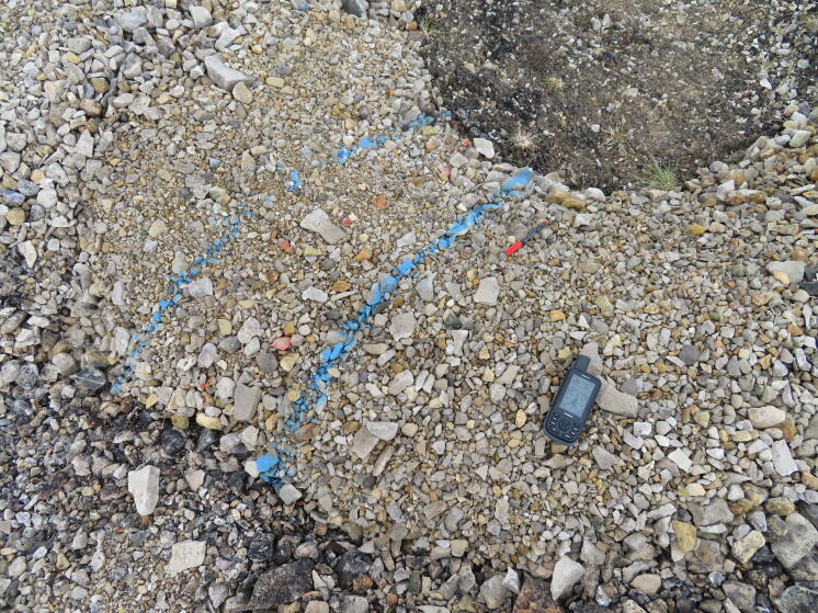 Andreas hat dieses Jahr wieder seine Datenlogger mitgebracht, die die Bodentemperatur messen können. Diese 5x5x5 cm3 großen Geräte werden – wenn alles gut geht – Daten für die nächsten 420 Tage aufzeichnen. Wir haben also schon jetzt einen sehr guten Grund, nächstes Jahr zurückkommen zu „müssen“. Wir entscheiden uns die Logger in einem inaktiven Teil der Moräne zu vergraben. Dazu heben wir ein Loch aus und platzieren den ersten Logger in 50 cm, den zweiten in 30 cm und den dritten in 20 cm Tiefe. Aufgrund der Erfahrungen der letzten Jahre binden wir lange rote Schnüre an die Logger, die es uns hoffentlich erleichtern sollten, sie im nächsten Jahr wieder zu finden. Im Jahre 2017 mussten wir ein großes Loch graben, um einen der Logger wieder zu finden. Wir hoffen, mit der neuen Methode wird dies einfacher werden und wir uns die großflächige Grabungsarbeit ersparen können. Aber natürlich verlassen wir uns nicht nur auf die Schnüre, sondern dokumentieren alles mit Fotos und zu guter Letzt mit dem DGPS. Damit haben wir unser Tagessoll erfüllt. Einzig der Besuch einer Erosionsstruktur, die wir vor ein paar Jahren untersucht hatten, steht noch an. Unsere damals gebauten Steinmänner sind noch immer zu erkennen und auch die grobe Form der Struktur ist noch zu erkennen. Allerdings gibt es keine scharfe Abbruchkante mehr, sondern ein eher eingeebnetes, abgerundetes Terrain. Ich mache Fotos und es wird interessant sein, diese mit den damals gemachten Aufnahmen zu vergleichen.