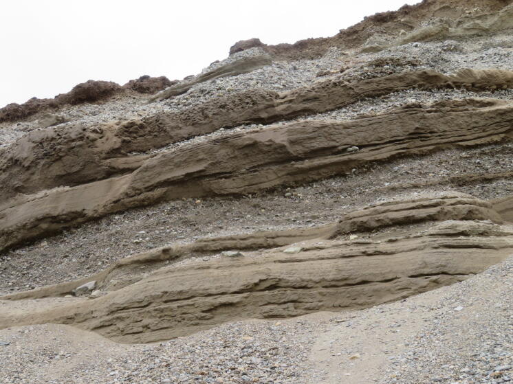 Aber schließlich ist jeder für den Landgang fein gemacht hat und wir können los. Es fällt uns sofort auf, dass das Gelände dieses Jahr viel trockener ist als im letzten Jahr. Das klingt erst einmal nicht sonderlich dramatisch, macht aber einen Riesen Unterschied, da wir dadurch viel schneller unterwegs sind. Unsere erste Station heute ist ein Hügel, der letztes Jahr durch einen Gletscherbach so angeschnitten wurde, dass wir dort Eis im Untergrund sahen. Da das nicht unähnlich zum Mars ist, wo wir vermutlich auch solche Strukturen sehen, sind wir natürlich alle gespannt, was wir heute lernen werden. Als wir dort ankommen, ist die Enttäuschung aber nicht zu leugnen. Denn im ersten Moment sehen wir kein Eis. Stattdessen sehen wir fantastische sedimentäre Strukturen, die alles wieder wettmachen. Der Gletscherbach, der über die weite Ebene mäandriert, hat hier wunderbare Lagen von feinem Sand und Schluff abgelagert, in die immer wieder Linsen von Kies eingeschaltet sind. In den Kieslagen sieht man sehr schön, dass es zu einer gradierten Schichtung kam, also dass erst gröberes Material abgelagert wurde und dann feineres bevor der nächste Zyklus begann. Und schließlich sehen wir in der Wand auch ein 20x20cm großes Loch. Wir erweitern es und siehe da: Wir finden in ca. 20-30 cm Tiefe klares Gletschereis und darunter eine kleine Eishöhle mit tonigen Sedimenten. Wir vermuten, dass der Gletscher hier Eis hinterlassen hat, das später durch den Gletscherbach mit den oben beschriebenen Sedimenten überdeckt wurde.